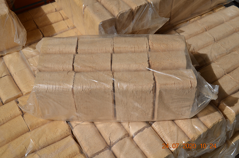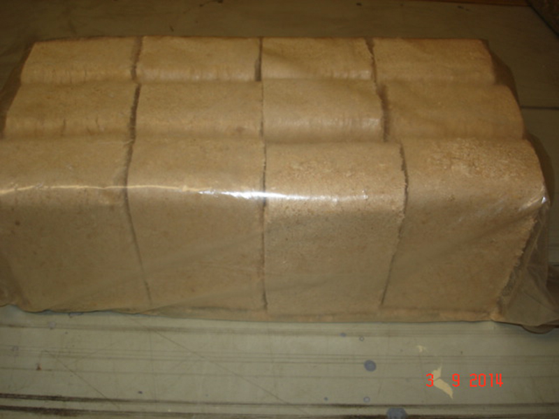 - brykiet kostka – 12 kostek o wymiarach 6 cm x 9 cm x 15 cm w opakowaniu foliowym o wadze 10 kg, 96 paczek na palecie Euro,