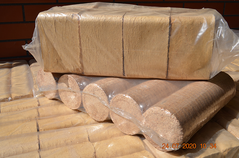 - brykiet walec – 5 walców o wymiarach średnica 9 cm, długość 30 cm w opakowaniu foliowym 10 kg, 96 paczek na palecie Euro.
